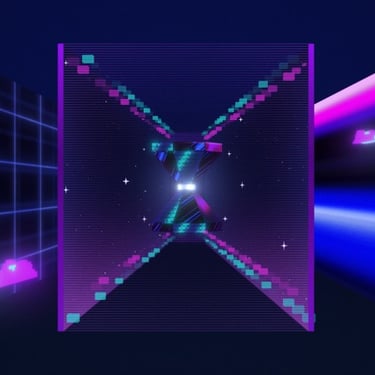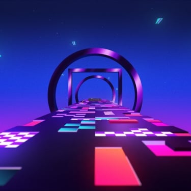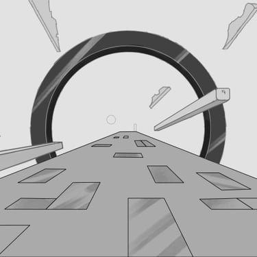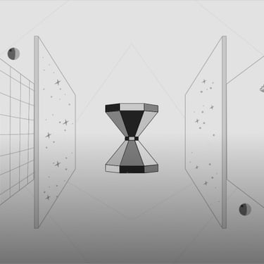 where selecting an hourglass keyframe launches the viewer into a stylized motion tunnel.